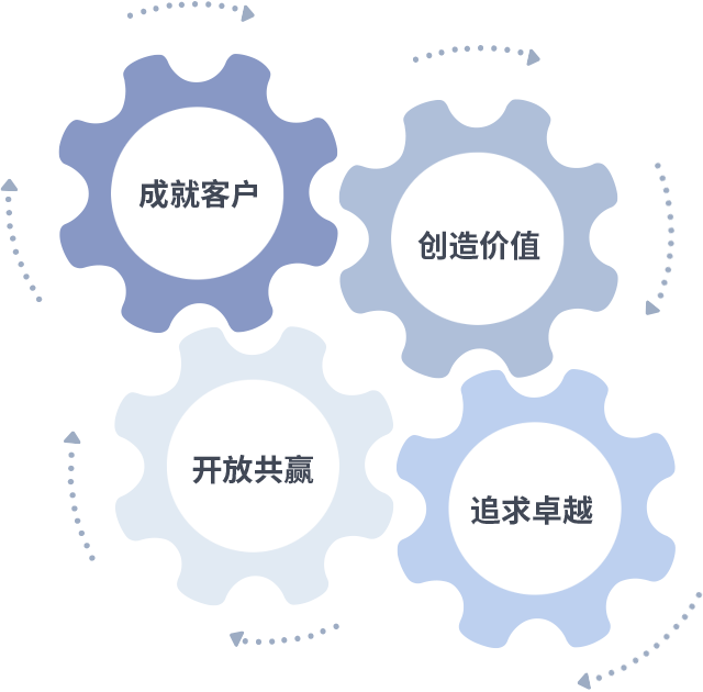 成就客户是一切决策的出发点,创造价值是衡量所有工作的标准,追求卓越是摩根娱乐做事做人的态度,开放共赢是摩根娱乐的格局也是最终的结果。价值观的齿轮环环相扣,推动着组织里的每个人不断向前。